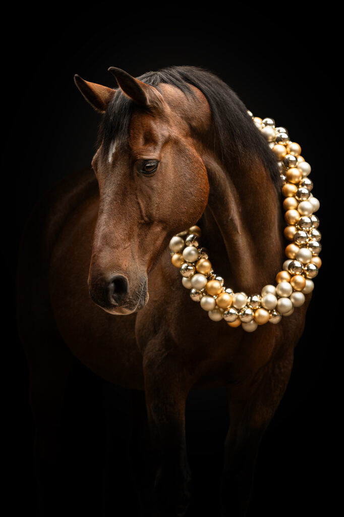 Weihnachten steht vor der Tür und da dürfen weihnachtliche Fotos natürlich nicht fehlen! Der Kranz ist bereit um dein Pferd zu schmücken. Er lässt sich hinten öffnen und muss nicht über den Kopf gezogen werden. Die Farbe der Kugeln kannst du individuell wählen. Ebenso kannst du auf Wunsch auch ein Lichterketten-Leuchten im Hintergrund bekommen. Dein Pferd muss dafür auch keine besonderen Tricks beherrschen, ein bisschen still stehen bleiben reicht vollkommen 😉